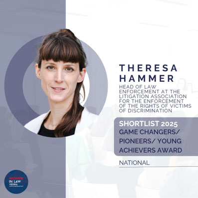 Die österreichische Juristin Theresa Hammer gilt als eine der führenden Stimmen im Kampf gegen Diskriminierung und für Gleichstellung. Sie verbindet juristische Expertise mit strategischem Engagement und macht das Recht damit zu einem wirksamen Werk zeug für gesellschaftliche Veränderungen. Seit 2022 ist Theresa Hammer Geschäftsführerin und Leiterin der Rechtsdurchsetzung beim Klagsverband in Wien. Dort verantwortet sie die strategische Prozessführung, leitet ein Anwaltsteam und führt richtungsweisende Verfahren, die den Schutz von Diskriminierungsopfern stärken und den Zugang zum Recht verbessern. Ergänzend engagiert sie sich in Öffentlichkeitsarbeit, Bildungsprojekten und Menschenrechtsmonitoring, um Benachteiligungen sichtbar zu machen und Reformen anzustoßen. Zudem wirkt Hammer an internationalen Menschenrechtsberichten, etwa für den UN-Ausschuss zur Beseitigung der Diskriminierung gegen Frauen (CEDAW), mit und bringt ihre Expertise in Monitoring-Gremien zur Umsetzung der UN-Behindertenrechtskonvention ein. Mit ihrem Engagement trägt Hammer entscheidend dazu bei, nicht nur einzelnen Diskriminierungsopfern zu ihrem Recht zu verhelfen, sondern auch einen strukturellen Wandel hin zu mehr Gleichstellung und Gerechtigkeit zu bewirken. Die Bewerbungen für den Justitia Award 2026 starten im Jänner 2026. Die WomenInLaw Initiative freut sich über jede Bewerbung und das Justitia Awards Election Committee wird diese respektvoll prüfen.